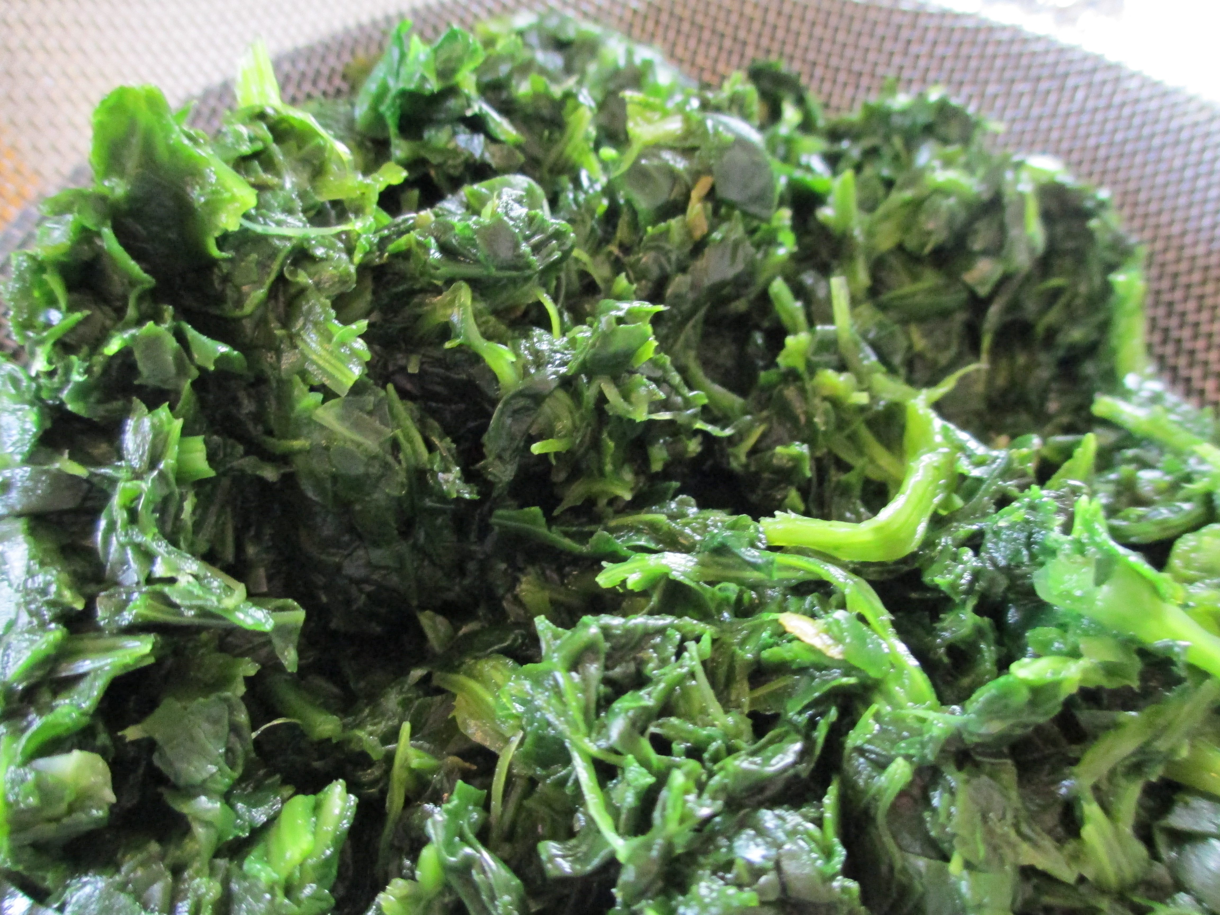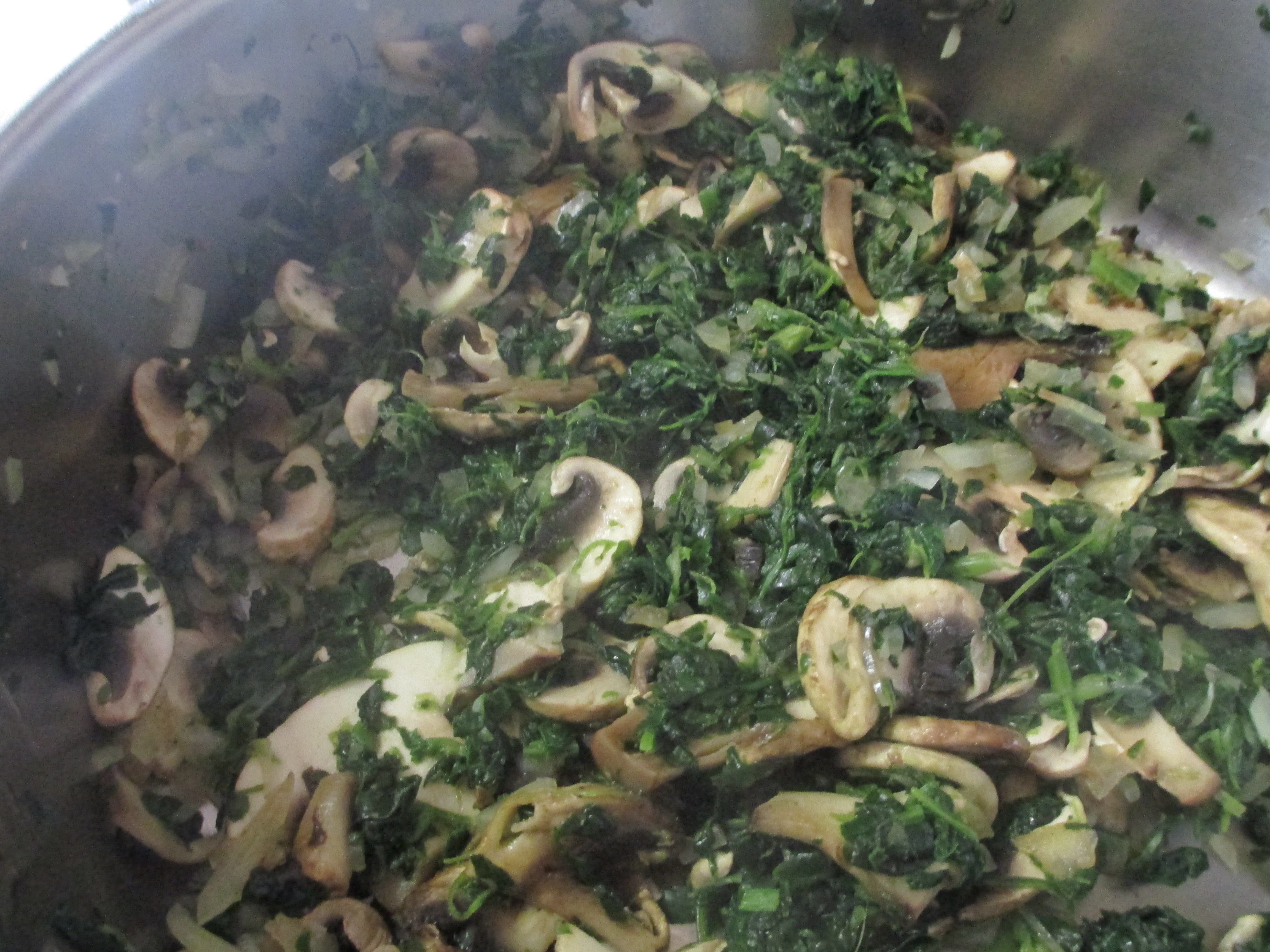 Squeeze all of the liquid out of the thawed spinach. Heat a 2-quart sauce pan and add vegetable oil. Add onion, mushrooms and spinach. Sautee on medium heat for about 5 minutes until mushrooms brown. Season to taste with salt and pepper.