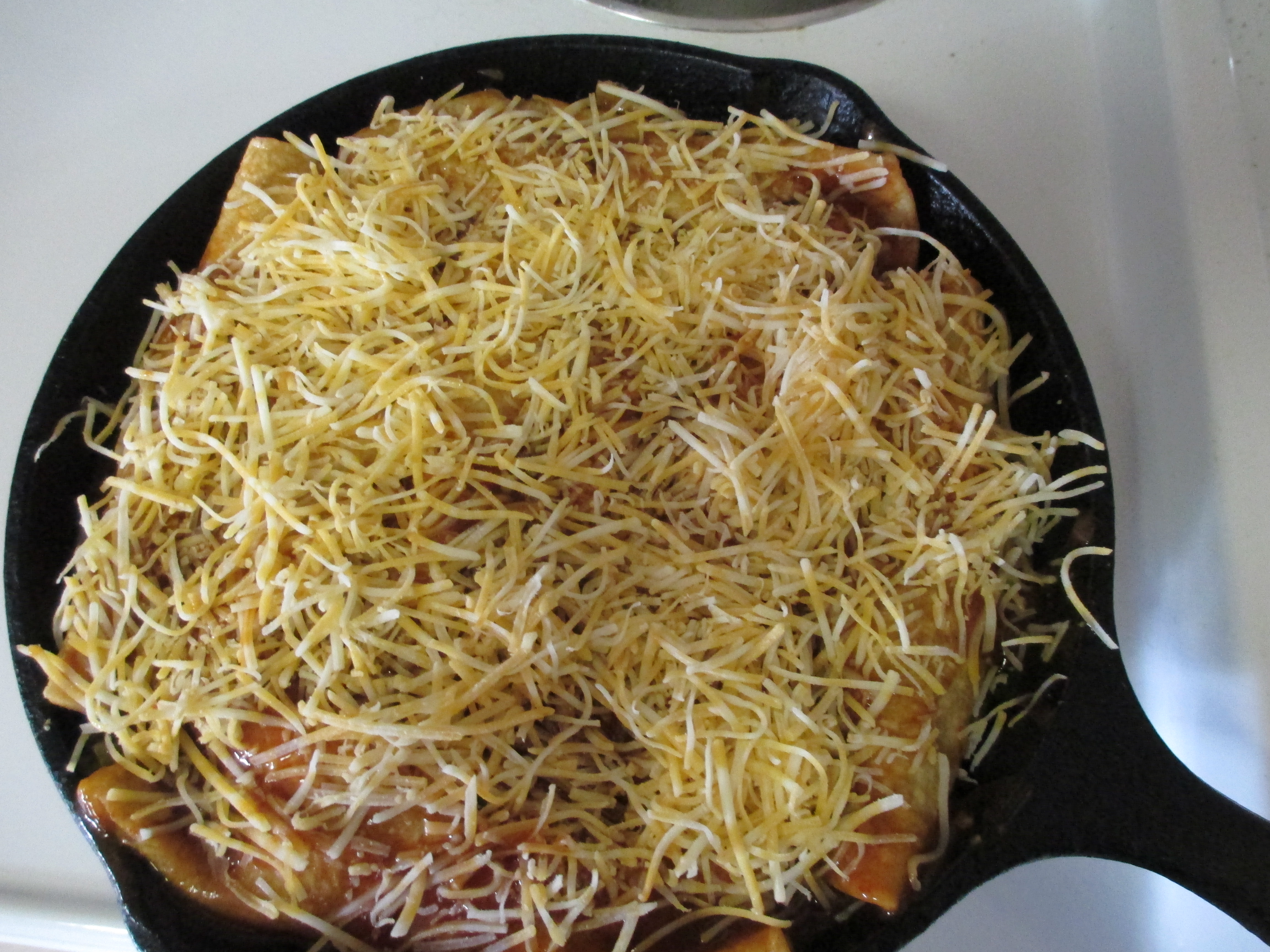 Add about 2 tablespoons of cheese. Roll up and set in place in the skillet.